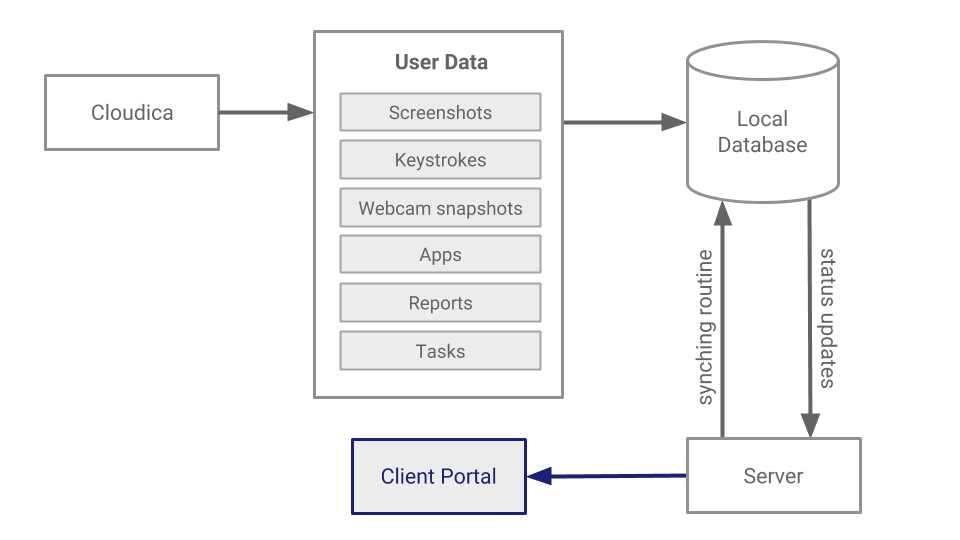 Once a user logs in, the software works by capturing remote user data from the machine where it is installed and stores them in localDB. A synching routine runs in the background to check for new data and performs an http/https-based request to the server. The response received by the client is processed and synchronization status is updated.